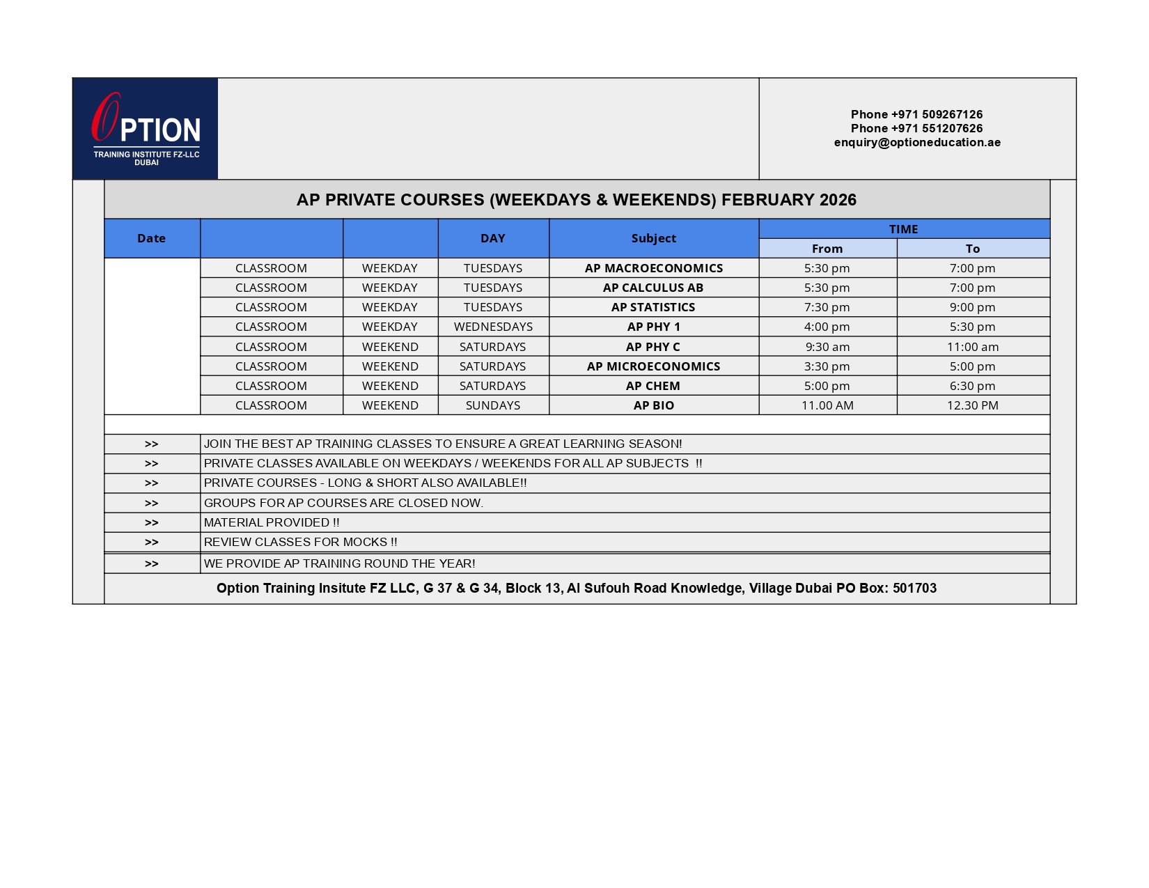 Option Training Institute Dubai, UAE offers an amazingly effective training platform for AP Prep in the following areas. The coaching for AP subjects is conducted in GROUP as well as in PRIVATE CLASSES that are planned to optimize students’ performances. Interestingly, we started the AP training in only private classes to make sure that we had got our platform and level of training right. After 2 years of exemplary results, we opened the AP courses in groups and now have made them available year long!