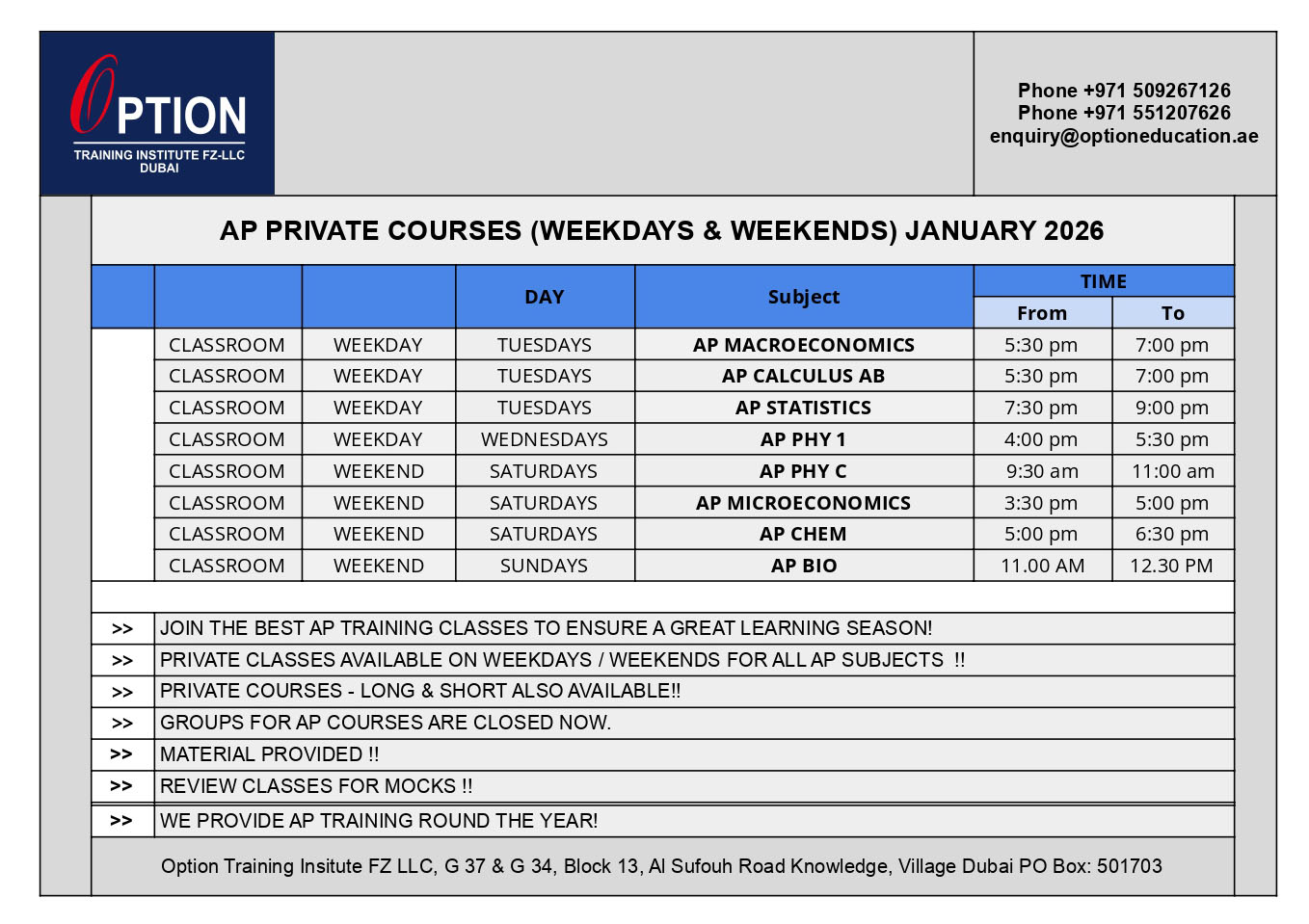 Option Training Institute Dubai, UAE offers an amazingly effective training platform for AP Prep in the following areas. The coaching for AP subjects is conducted in GROUP as well as in PRIVATE CLASSES that are planned to optimize students’ performances. Interestingly, we started the AP training in only private classes to make sure that we had got our platform and level of training right. After 2 years of exemplary results, we opened the AP courses in groups and now have made them available year long!