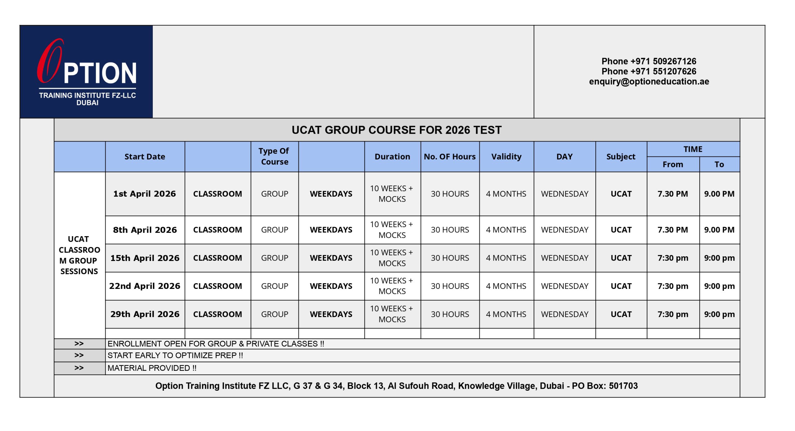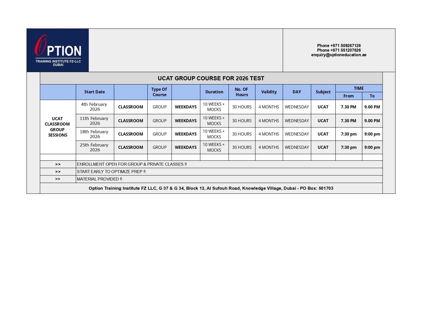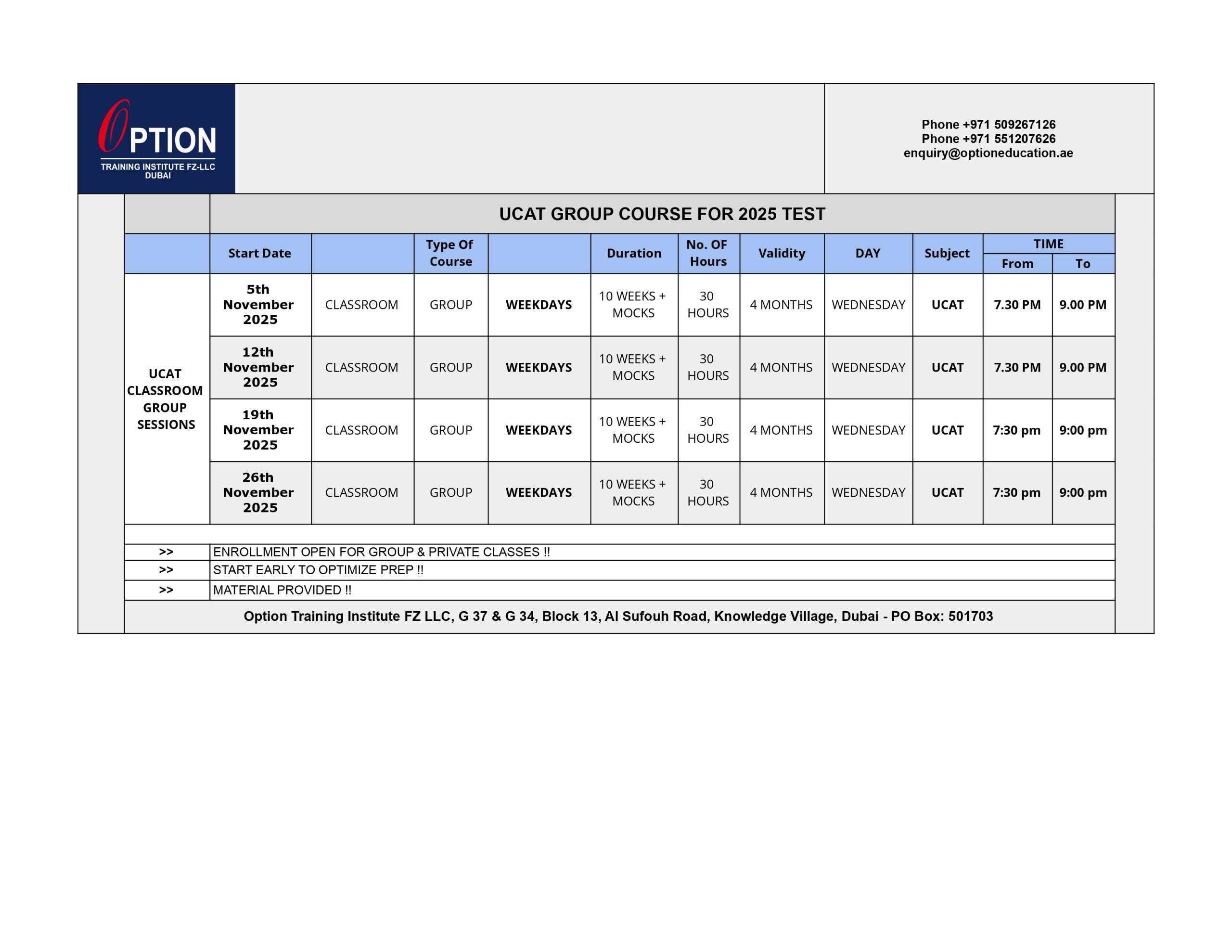At Option Training Institute, Knowledge Village, Dubai, we provide result oriented, strategy based UCAT test preparation courses – one -on- one and group. By using progressive training methods to maintain the efficiency of the training and to work on the individual student’s weak areas, Option undoubtedly provides students with the finest training in a conducive class environment thereby enabling students to achieve optimum results.